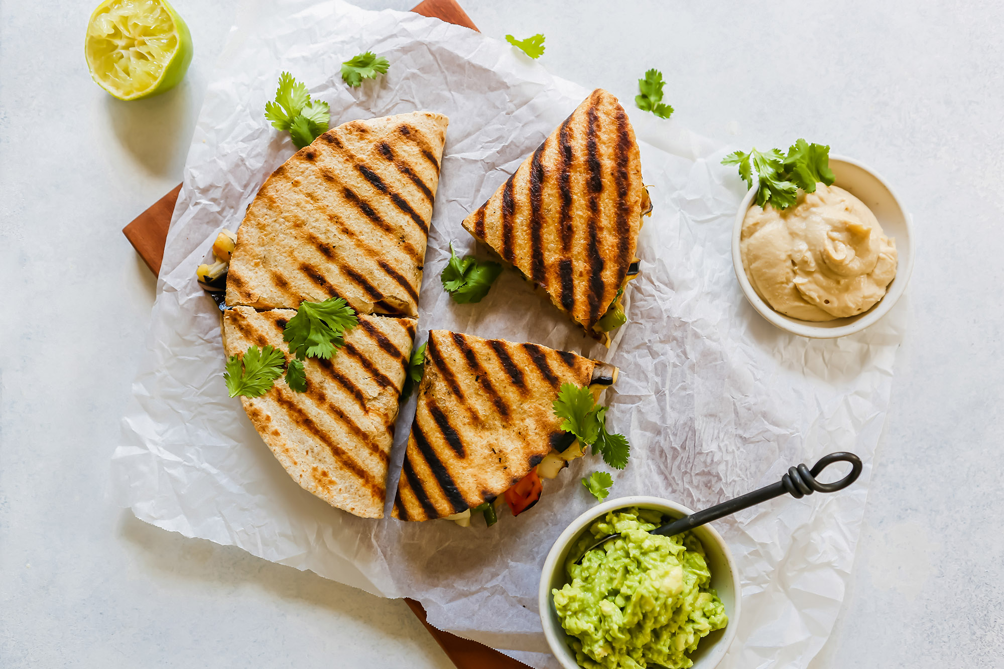 - Turn off the heat and transfer the quesadillas to a cutting board to slice each one in half. Serve immediately with mashed avocado, the remaining hummus and garnish with fresh cilantro.